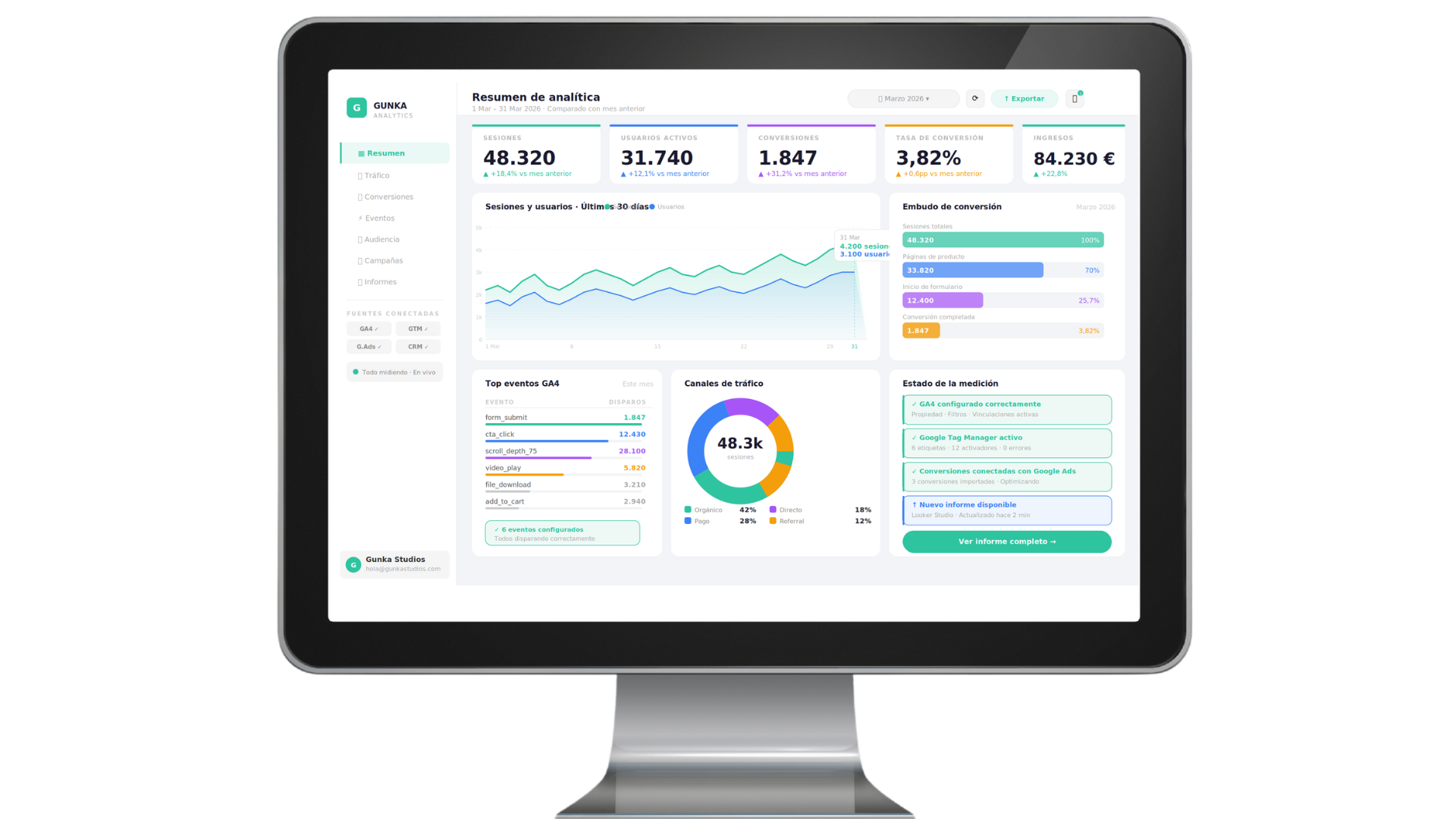 Definimos KPIs claros desde el inicio y los monitorizamos de forma continua. Los resultados se miden en función de los objetivos de cada proyecto: visibilidad, captación, conversión o fidelización. Sin datos no hay estrategia, solo intuición.