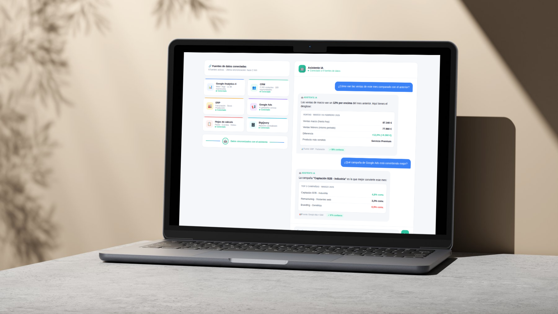 El asistente se conecta directamente a las fuentes de datos de tu empresa: GA4, CRM, ERP, BigQuery, Looker Studio, Power BI, hojas de cálculo, bases de datos internas… cualquier fuente que contenga información de tu negocio.